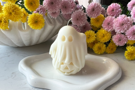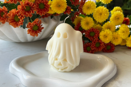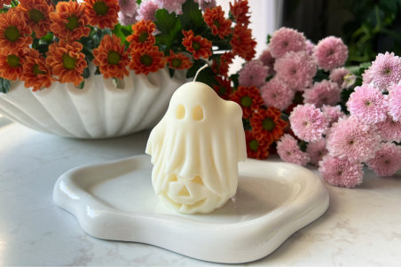 Poczuj magię jesiennych wieczorów z wolnostojącą świecą w kształcie duszka z halloweenową dynią. Już na półce otula wnętrze ciepłym, słodko-korzennym aromatem – soczysta dynia i delikatna biała brzoskwinia łączą się z owocową świeżością, w sercu rozkwita aksamitny karmel, słodki cukier waniliowy, aromatyczne piżmo oraz ciepłe nuty cynamonu i gałki muszkatołowej, dopełnione subtelnymi owocami suszonymi.